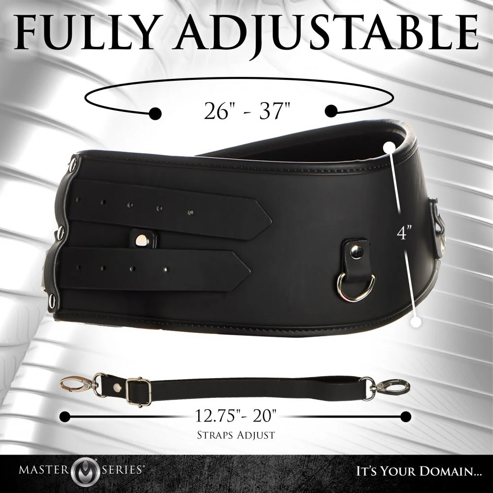 Keep your submissive in place while they are forced to endure orgasm after orgasm with this Forced Orgasm Belt! Designed to be used with the 50X Saddle Pro Sex Machine, it tightly wraps around their waist and holds them in place as they ride the thrusting and vibrating saddle! The vegan-friendly leather is a classic, smooth and shiny black with buckles to help adjust it. It accentuates their curves and accents their waist. Straps connect the belt to the machine via lobster clips and also have an adjustable length. All metal is nickel-free for sensitive skin. To clean, wipe down with a soft cloth, warm water and mild soap.